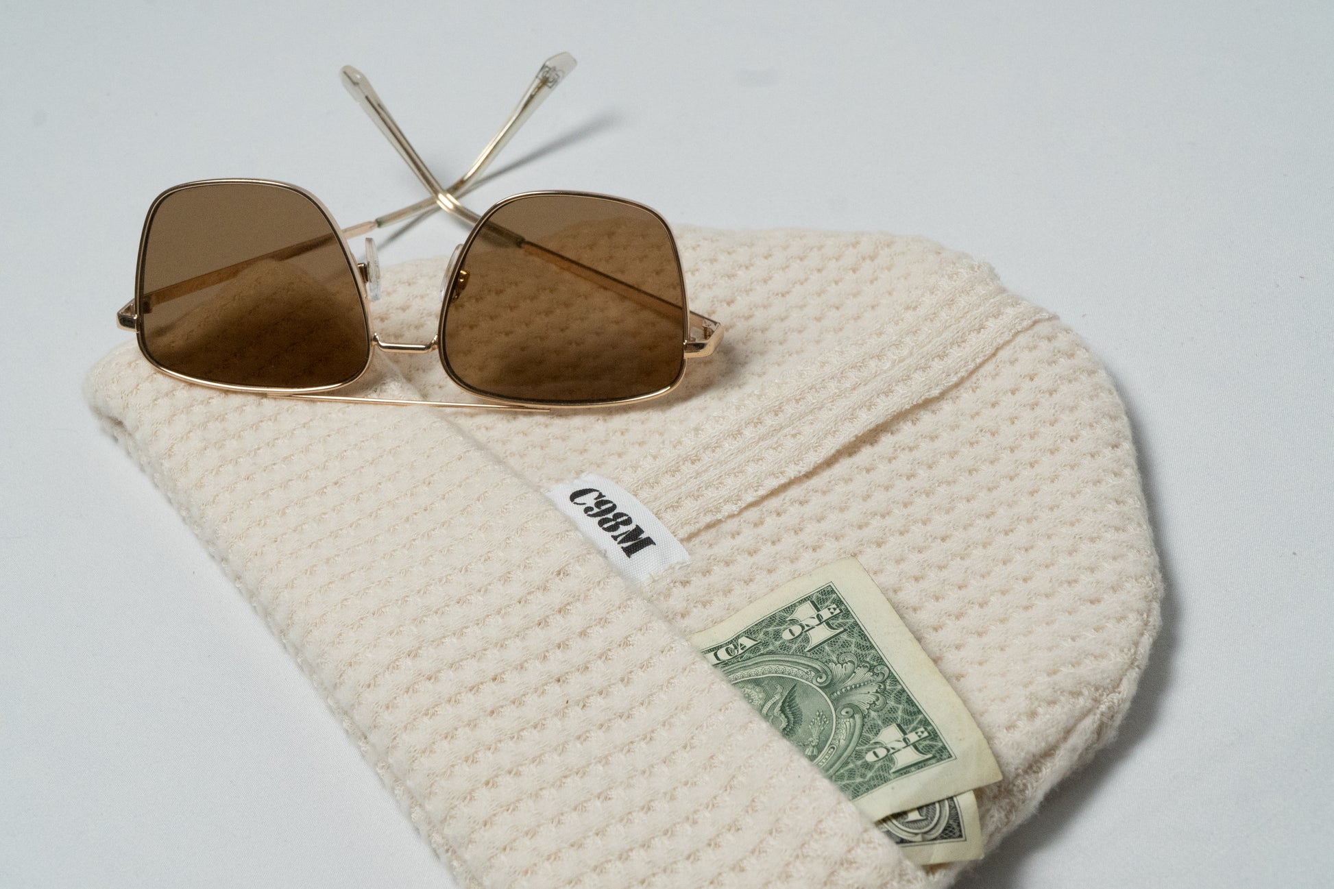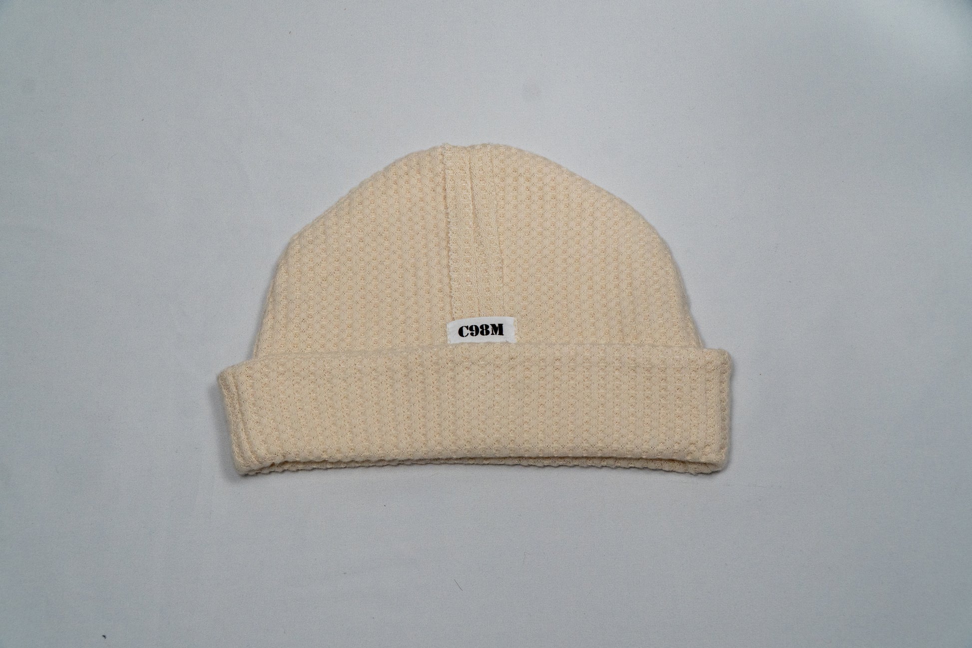 Knit beanie features a large embroidered face logo patch and ribbed detailing, crafted from chunky wool.